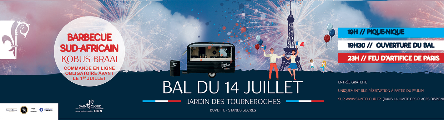 Les informations recueillies sur le formulaire de réservation sont enregistrées dans un fichier informatisé par la Mairie de Saint-Cloud pour vous permettre de vous inscrire au Bal du jeudi 14 juillet 2022 et de commander un menu barbecue. Elles seront supprimées au maximum 30 jours après l'événement et sont uniquement destinées aux services de la Mairie de Saint-Cloud, ainsi qu'à notre sous-traitant Eventmaker.